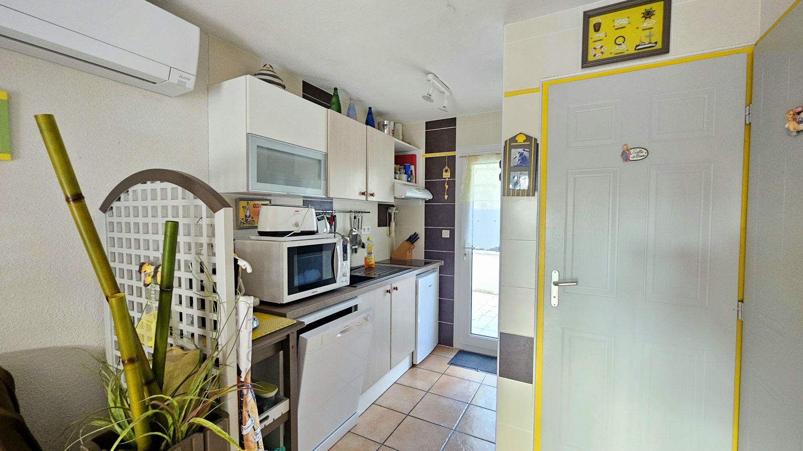 Découvrez cette charmante maison en copropriété située à seulement 200 mètres de la Méditerranée et des commerces de Vias Plage. Nichée dans un environnement calme, elle offre deux grandes terrasses idéales pour profiter du climat ensoleillé, un garage indépendant ainsi qu'une place de parking privative devant le garage. Au rez-de-chaussée, vous trouverez un salon-séjour lumineux avec une cuisine équipée ouverte donnant accès à une terrasse à l'arrière de la maison, parfaite pour vos repas en extérieur, une salle d'eau ainsi qu'un wc indépendant. La maison est totalement équipée et prête à accueillir des locataires saisonniers ou à devenir votre pied-à-terre pour les vacances. À l'étage, deux chambres confortables vous attendent. L'ensemble est impeccable, avec du double vitrage PVC et la climatisation installée récemment au rez-de-chaussée et dans les deux chambres à l'étage. Super rapport qualité/prix pour ce bien rare sur le secteur, à saisir rapidement ! Prix : 179 000 € FAI